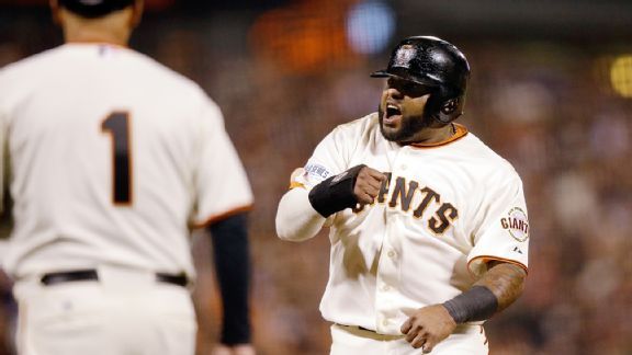 Buster Posey cut the deficit in the bottom half with a run-scoring single, tying Barry Bonds' team record of 21 career postseason RBIs. Pence's RBI single in the fifth caused Frasor to throw up both arms in frustration, Sandoval singled Pence to third and Juan Perez's sacrifice fly made it 4-all.