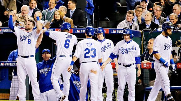 Kansas City out-hit the Giants 15-6 in another blowout in the first Series in which five games were decided by five runs or more. All nine Royals had hits by the third, matching the mark set by Arizona against the Yankees in Game 6 in 2001.